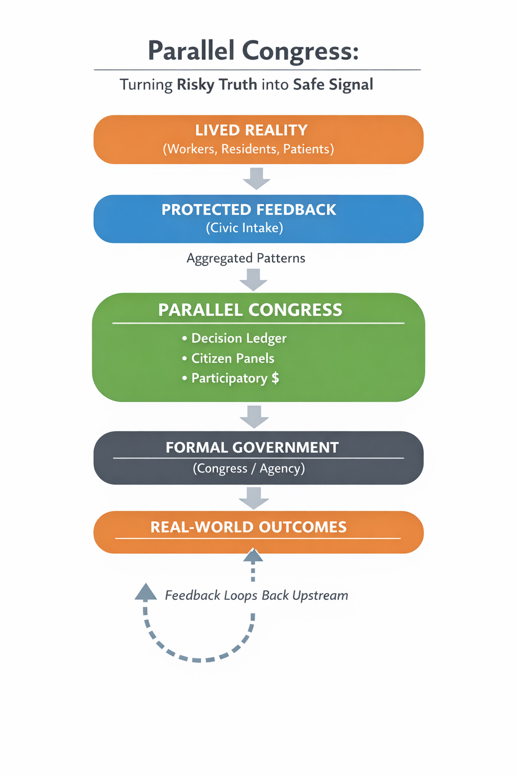 Congress does not reliably hear lived experience. It does not share decisions in a way people can understand. And once a policy causes harm, there is no clean, trusted mechanism to revise it.